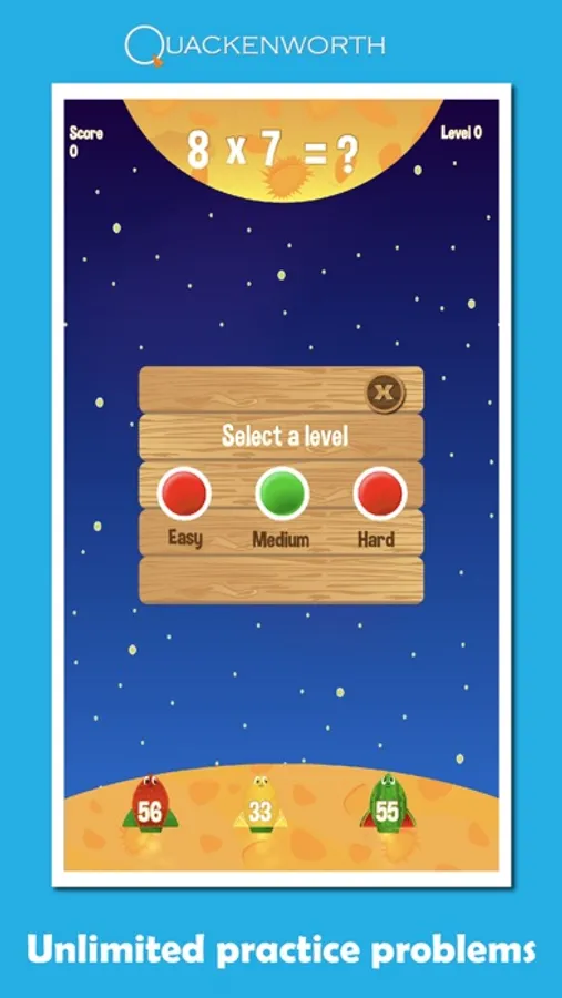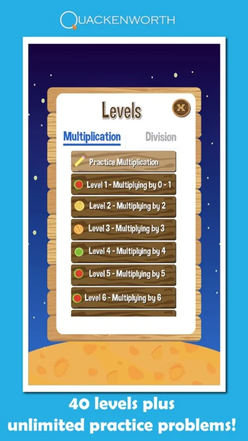 • 40 combined multiplication and division levels, plus an unlimited number of practice problems.