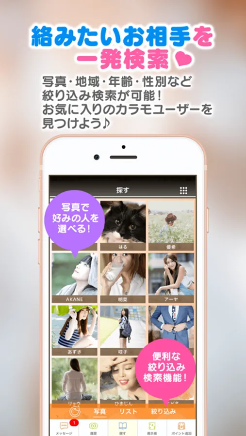 (STEP3):お気に入りのカラモユーザーを見つける ※写真・地域・年齢・性別で選択!