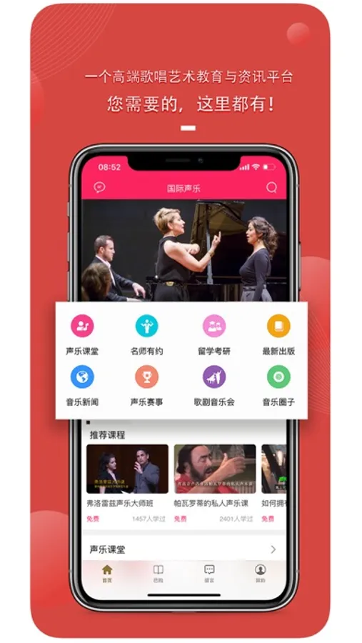 主要内容:专家声乐课堂在线教学,国内国际大师课,名家名唱,最新上演的歌剧,音乐会视频;