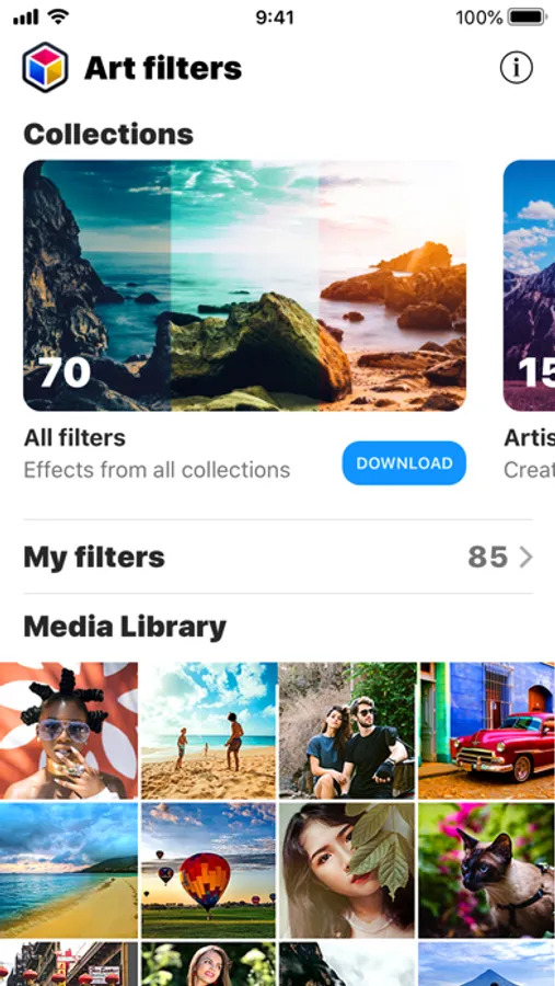 • 15 preset filters. Additional filters are available via in-app download as free and paid packages