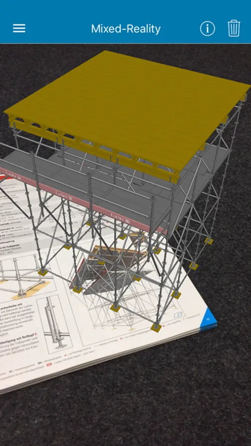 Mixed Reality combines real camera shots with digital scaffolding models. By doing so, the reality – i.e. all the things you can see – is supplemented with additional information in the form of 3D scaffolding objects. Using the Smartphone, digital elements can be seen in their actual surroundings and the Layher price lists are brought to life.