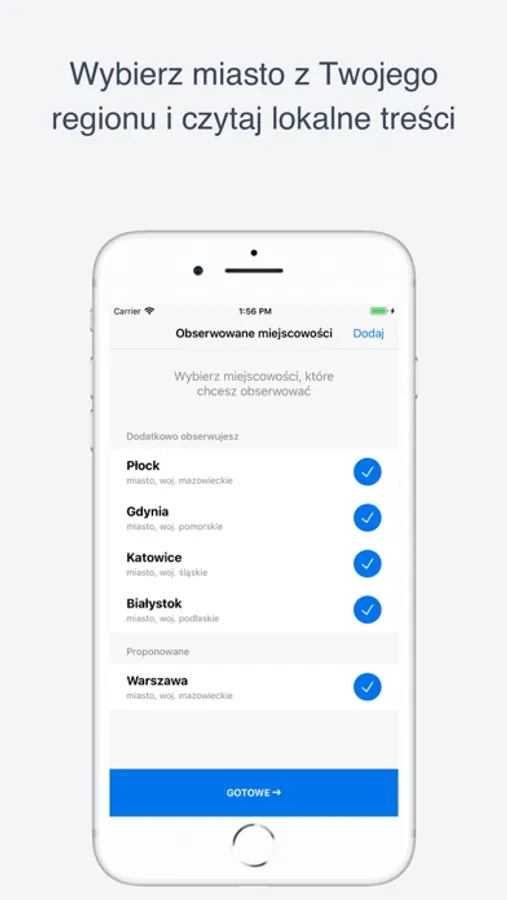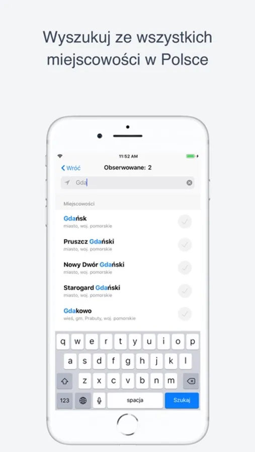 W aplikacji predefiniowanym miastem jest Warszawa, możesz jednak wybrać dowolne miejscowości, powiaty, miasta w Polsce, by otrzymywać informacje tylko z tych miejscowości, które naprawdę Cię interesują.