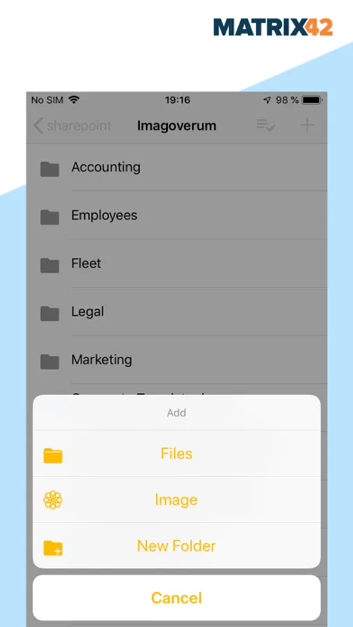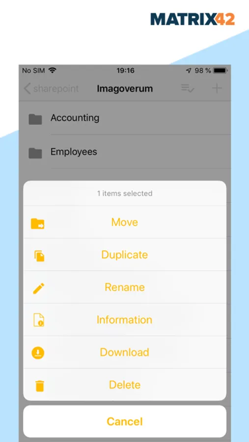 As part of Mobile Content Management in Silverback, the Documents app provides secure access to corporate documents from Matrix42 Silversync, Microsoft Sharepoint, OneDrive and Google Drive, at any time on any device. View and Download files. Do many operations on files and folders like renaming, moving, deleting, cloning.
