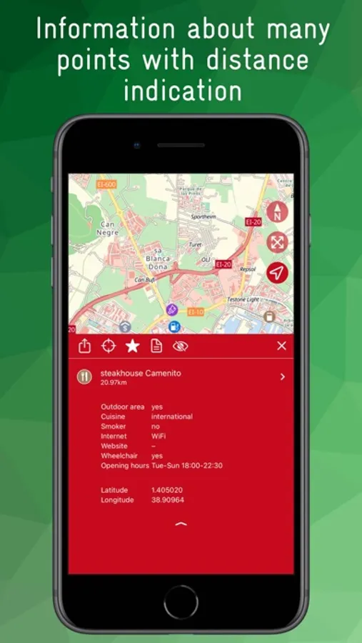 For many POIs there is further information such as opening hours, address, disabled access, ... Notes or favourites can be created for each POI, a history list shows the most recently used POIs, content can be shared.