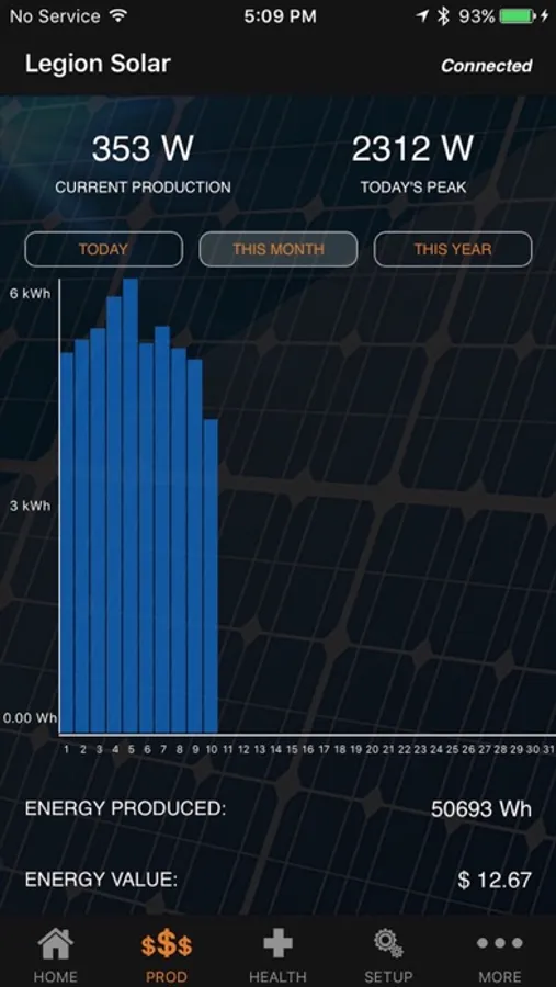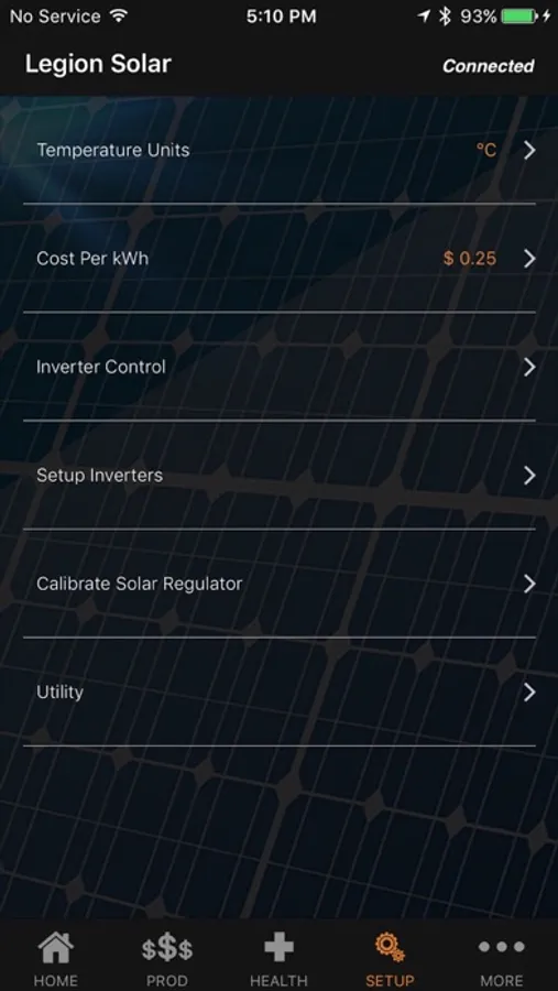 Legion Solar app is compatible with Solar Regulator V1.0 or later hardware. Connection is established via Bluetooth LE. Legion Solar app features include: