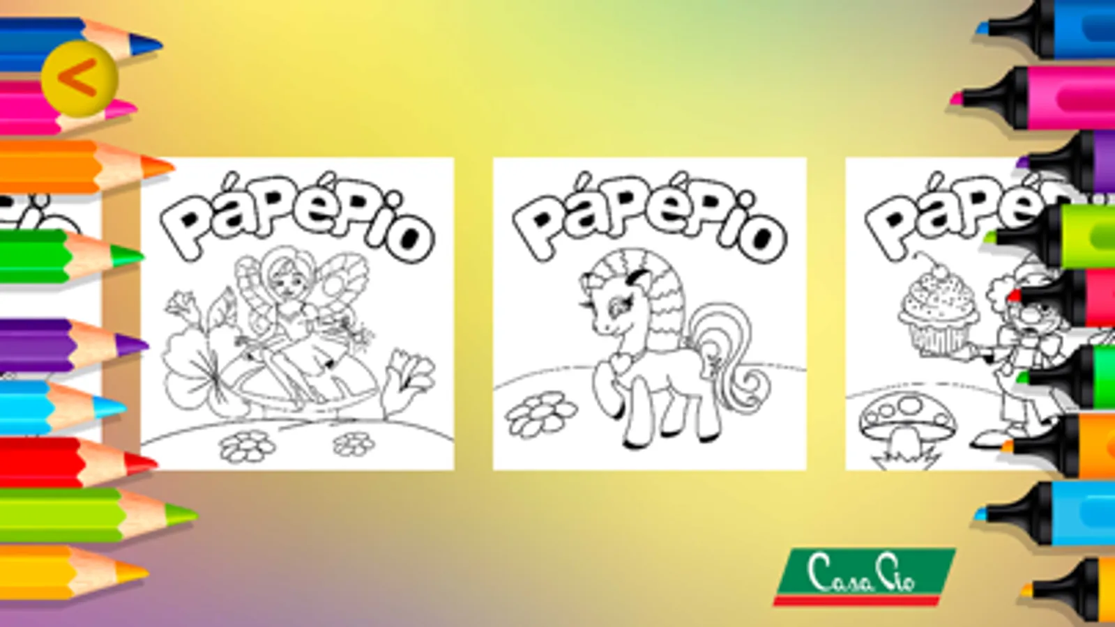 No menu Cantoria, as crianças vão se divertir cantando a música tema do Pá Pé Pio e vendo seu último vídeo. No Joguinhos, tem quebra-cabeças e diversos desenhos para pintar com o tema Pá Pé Pio. No Fotinhas, as crianças podem fazer fotos com vários frames do tema Pá Pé Pio.