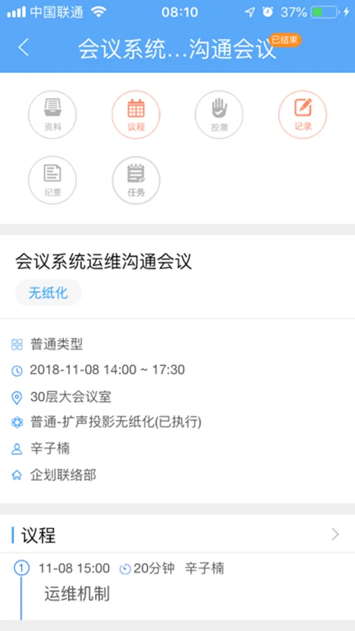 山西证券会议管理系统完全模拟了会议整个生命周期,实现了会议从提前预约、参会人管理、会议资料上传、会议信息通知、会服通知、会议室设备启动、会议签到、会中控制、会后任务下发、资料存档、统计分析等一系列会议相关的全自动化、信息化管理新模式。组织会议通过本系统打破了传统的多系统组织会议、人工打印大量会议资料、人工维护会议室设备开启关闭、人工通过各种渠道通知参会人会议信息、人工统计会议室使用情况等多种费时费力的会议组织形式。极大的提高了企业会议组织效率,节省大量人力、物力,为企业会议组织提供了更加便捷、方便、高效的管理新模式。