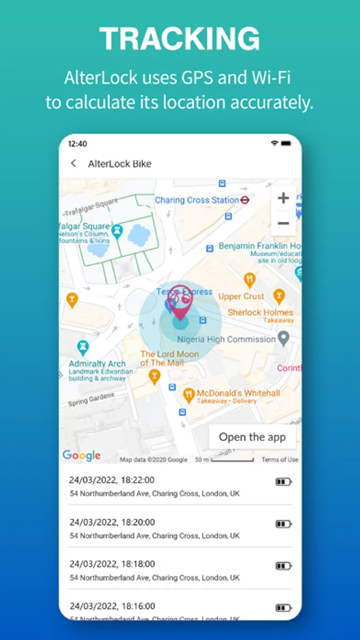 The application to use the AlterLock device to watch over your bike.