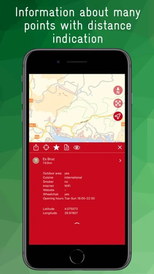 For many POIs there is further information such as opening hours, address, disabled access, ... Notes or favourites can be created for each POI, a history list shows the most recently used POIs, content can be shared.