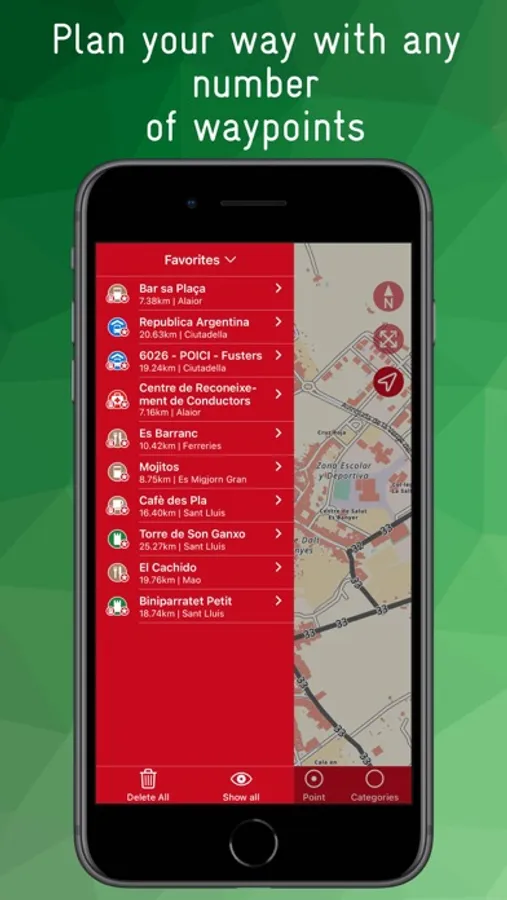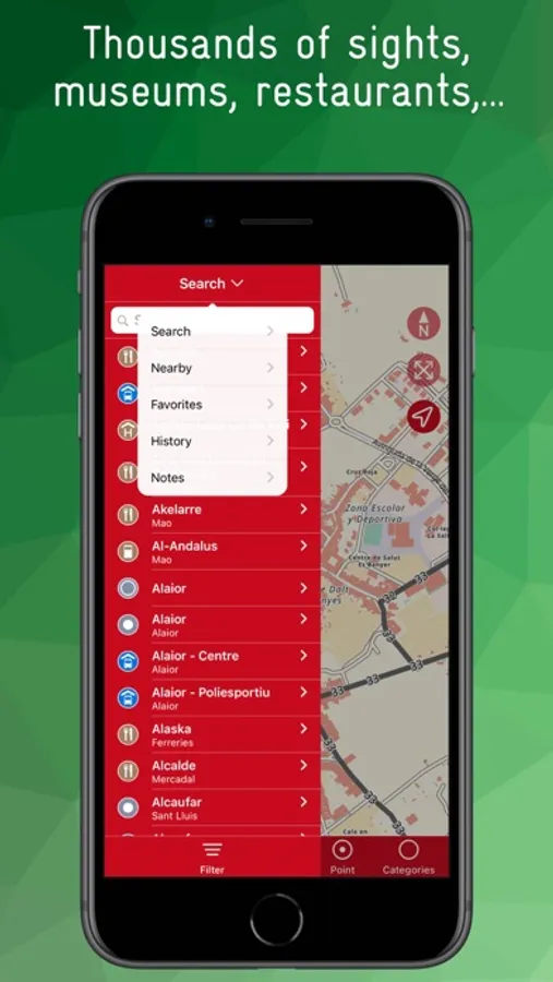 An integrated database allows you to search for POIs as well as a large number of streets, towns, villages, districts, etc. The search can be filtered by category and/or distance.
