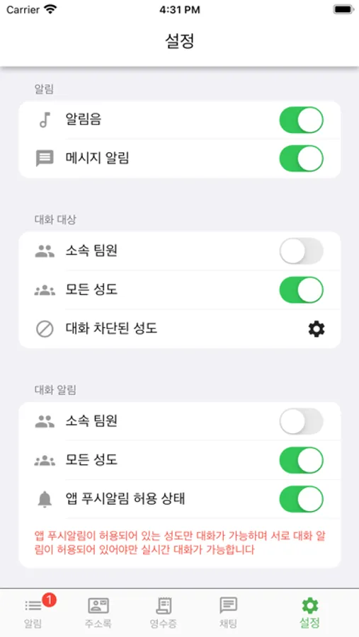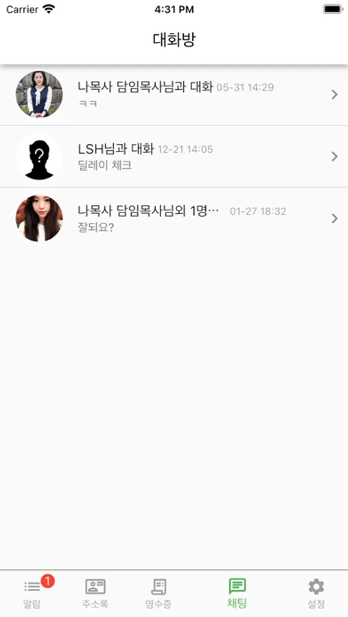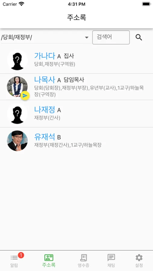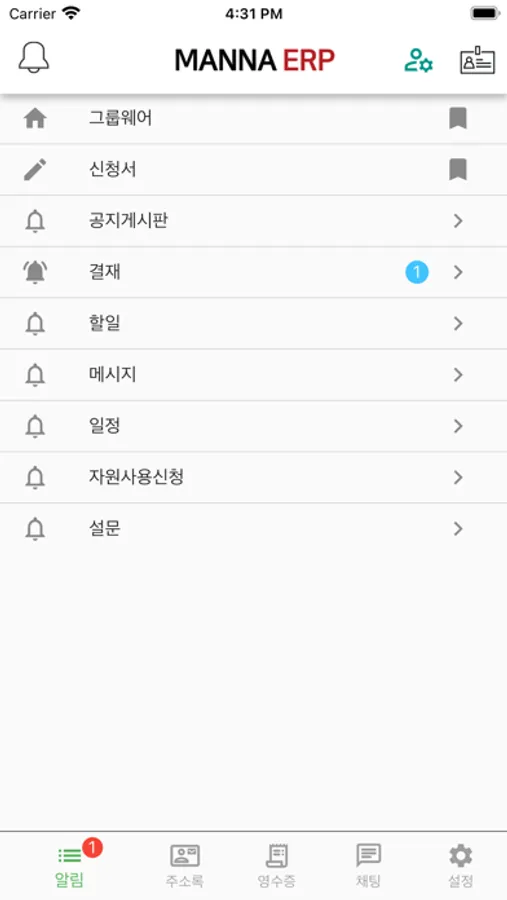 만나ERP에서 발생되는 알림을 알려주어 교회업무에 빠른 진행을 도와주고 주소록이 내장되어 교인검색이 가능하며 교인끼리 실시간 대화가 가능합니다.