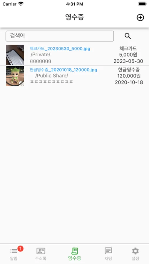 지출결의서에 이용될 영수증 첨부을 앱에서 관리 가능합니다.