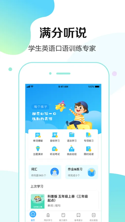 功能:主要针对小、初、高在校学生进行英语口语和听力的评测和训练,并提供课堂练习以及课后作业等功能模块,方便学生课上以及课下进行有关英语听、说等相关的训练,以提高相关能力水平。