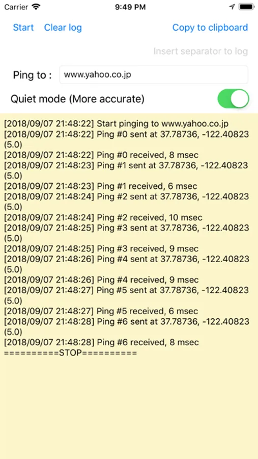 特徴は、実行しているiPhone, iPadの位置情報に基づき、送信時の緯度・経度及び精度(m単位)を同時に記録する点です。