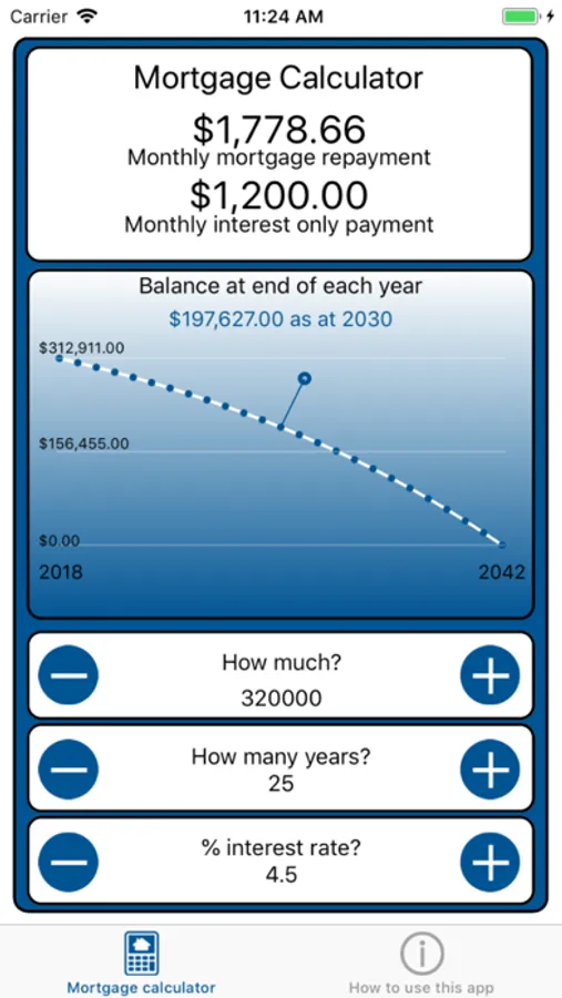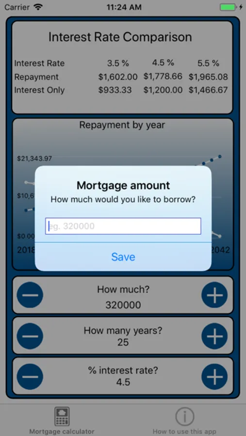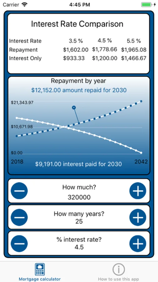 The mortgage calculator app displays summary information calculated using the mortgage amount, number of years and interest rate.