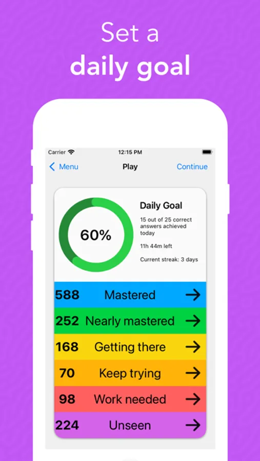 - Set a daily goal to help keep you on track and set up notification reminders for specific times of the day, allowing you to improve your vocabulary every day and learn new words rapidly through spaced repetition