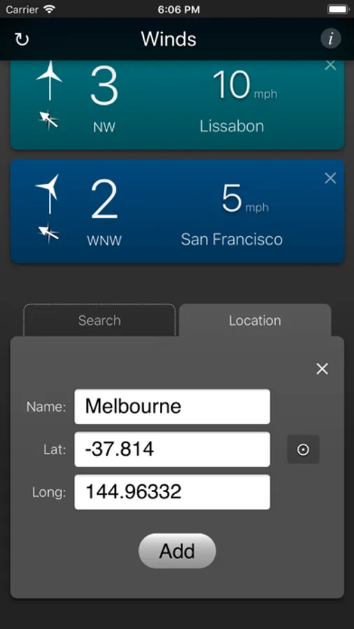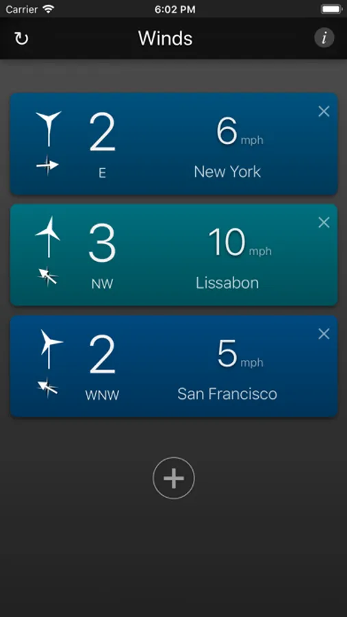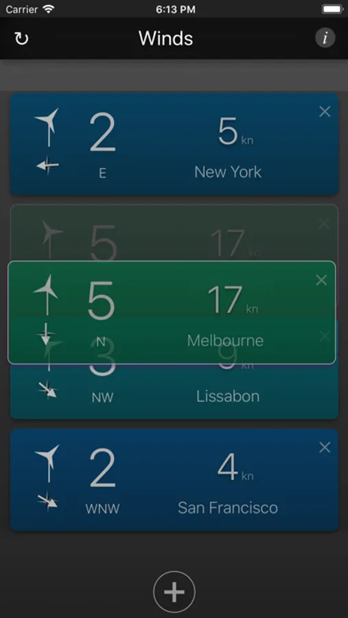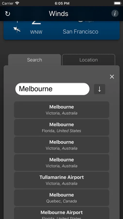 This application shows the current outdoor wind speed and direction for different locations, measured by a nearby weather station.
