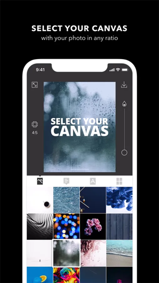 In the first step of creation, you can select what makes your canvas: your photo. You can resize the photo with two finger gestures and reposition it if you like. You can apply a blur filter on your photo with the slider on the right. Last but not least, we also provide a range of canvas ratios to which your design will adapt.