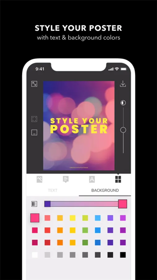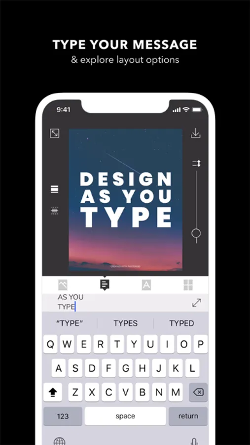 Let your message stands out and shine on a poster! Posteroid will literally 'design' your poster as you type, using its own adaptive layout logic. It is not about providing a sea of options but provoking one's creativity with the minimal set of controls.