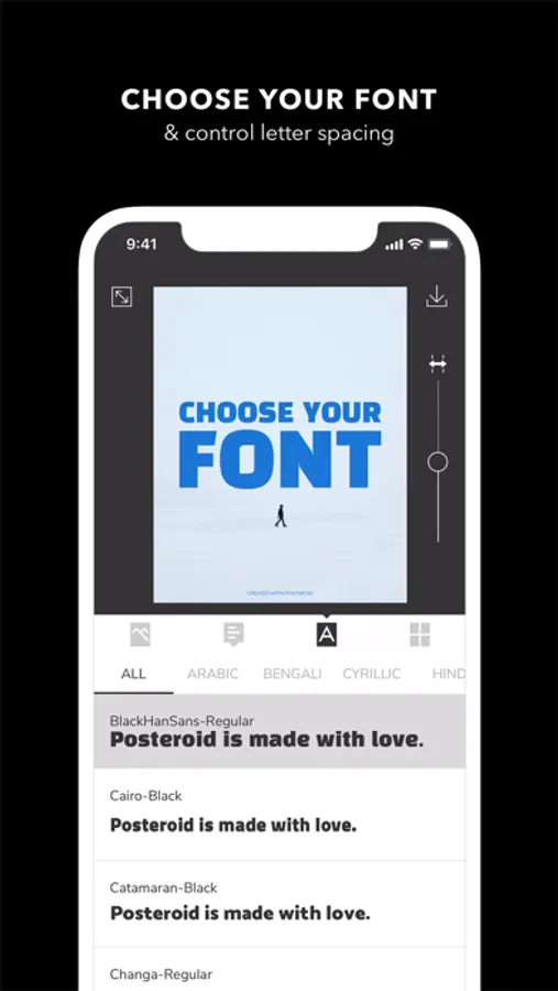 What typeface you use determines what voice your message has. Posteroid provides a selection of fonts covering many languages around the world. As the icing on the cake, the slider on the right allows you to adjust the letter spacing. You will find how charmingly all layout options apply it and how intensively the look of your message changes by that.