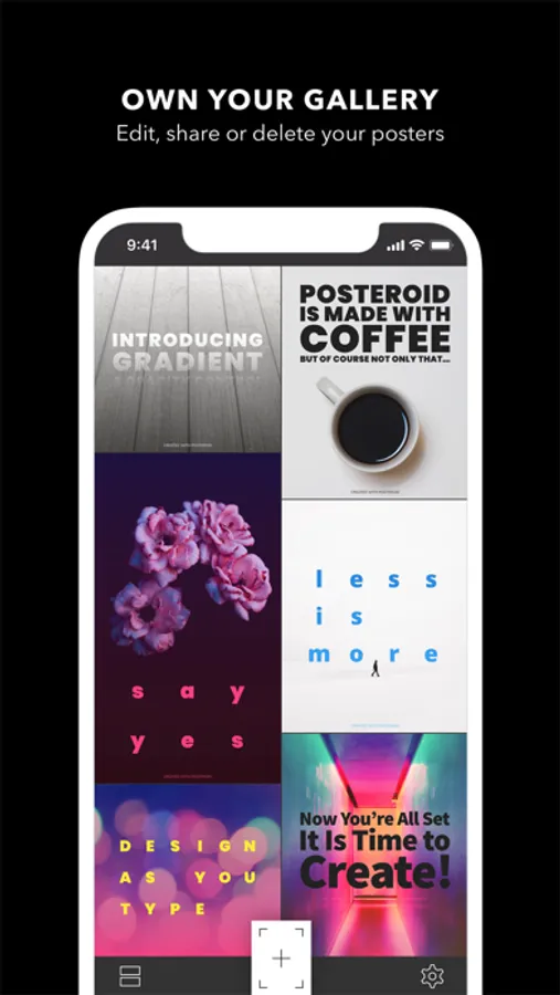 Now you have a beautiful collection of your creations. Tapping on a poster shows what you can do with it. You can edit it - all properties are editable from Canvas to Style. You can share it - anywhere you like from your camera roll to other social networks. Of course, you can delete it too. One last thing: The settings and properties you used in the last poster will remain for a new one you create, so there is no need to set everything again from the scratch.