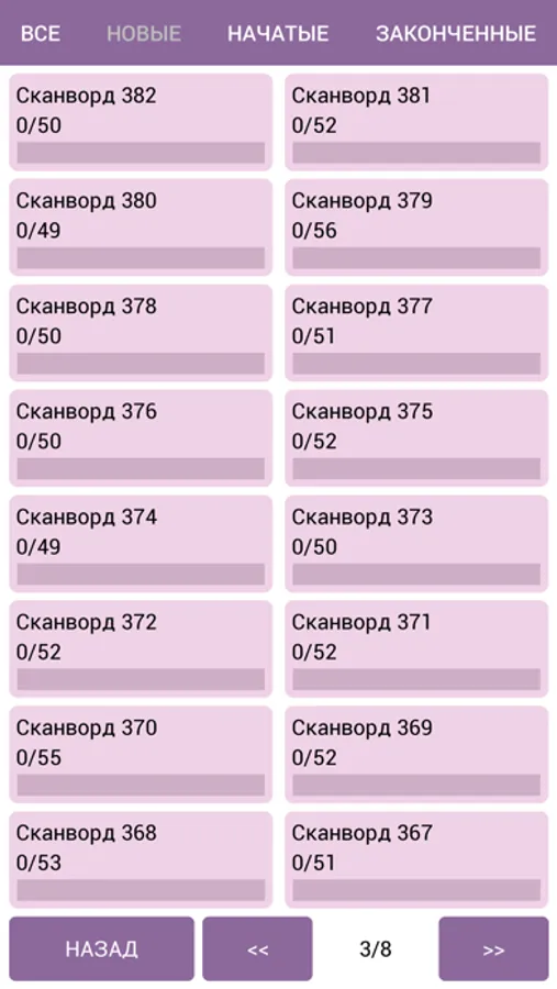 - Простая навигация. Сканворды выводятся по категориям: "Новые", "Начатые", "Законченные". Очень просто найти тот сканворд, в который вы играли в прошлый раз.
