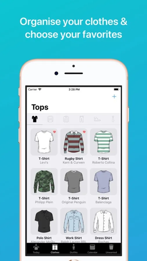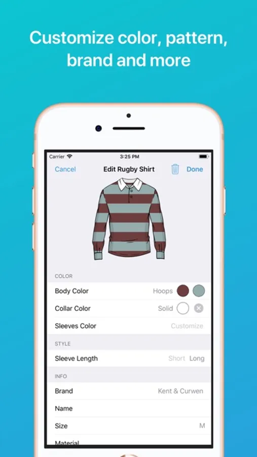 Keep track of the clothes you own, without having to photograph everything in your closet. Just select an item's color, pattern and style and Wardrobe will draw it for you. Further customization is available with optional details like brand, size, or you can set a different color and pattern for different parts of the item.