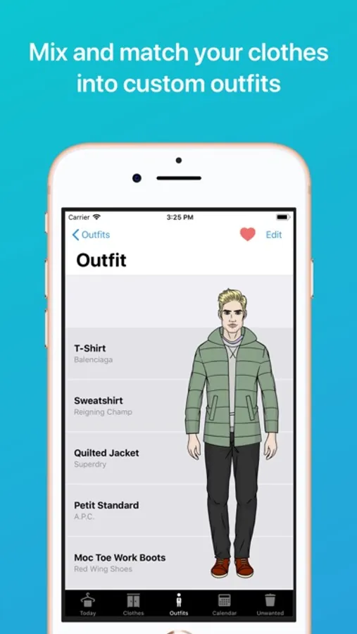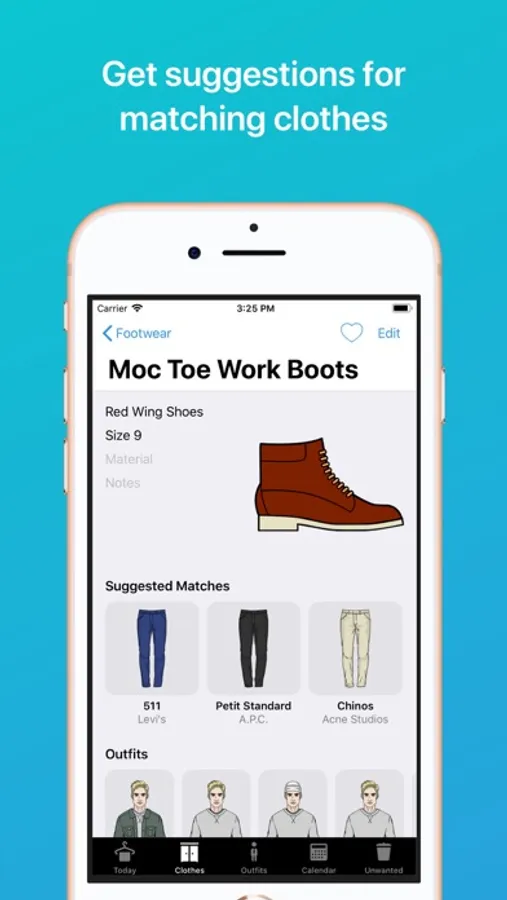 Get visual outfit suggestions. Wardrobe combines your clothes into outfits based on color, pattern and formality, and draws them so you can see what that combination would actually look like.