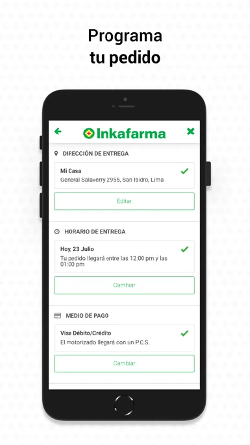 Recibimos pedidos a través de Inkafarma Móvil de Lunes a Domingo, 24 horas al día. Los pedidos recibidos entre las 08 horas (8 a.m.) y 22 horas (10 p.m.) de Lunes a Domingo, serán atendidos el mismo día. Los pedidos recibidos a partir de las 22 horas serán atendidos al día siguiente desde las 08 horas previa coordinación telefónica con el cliente. El horario de entrega puede cambiar sin previo aviso por disponibilidad de personal motorizado o por eventos en la zona de entrega.