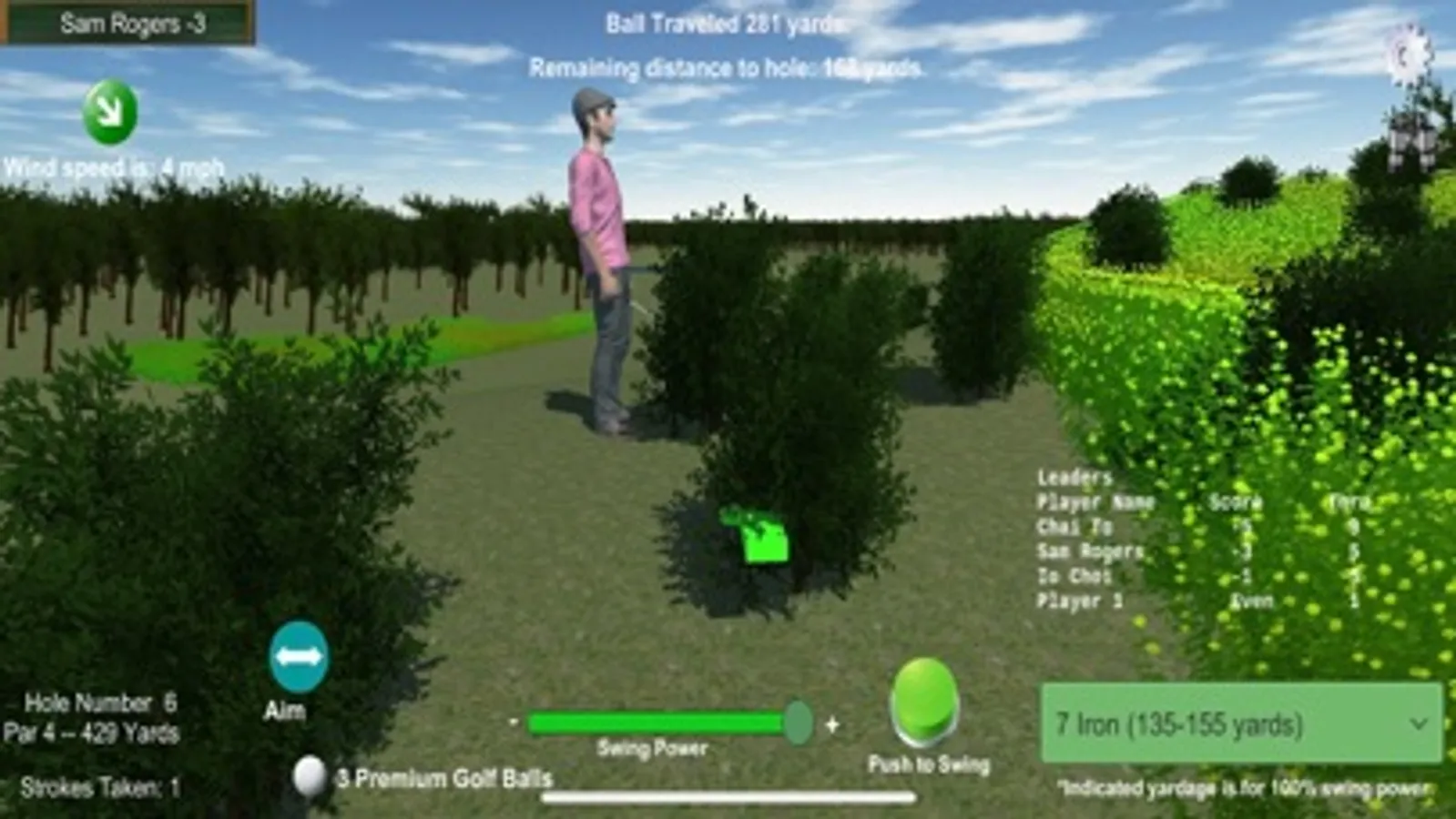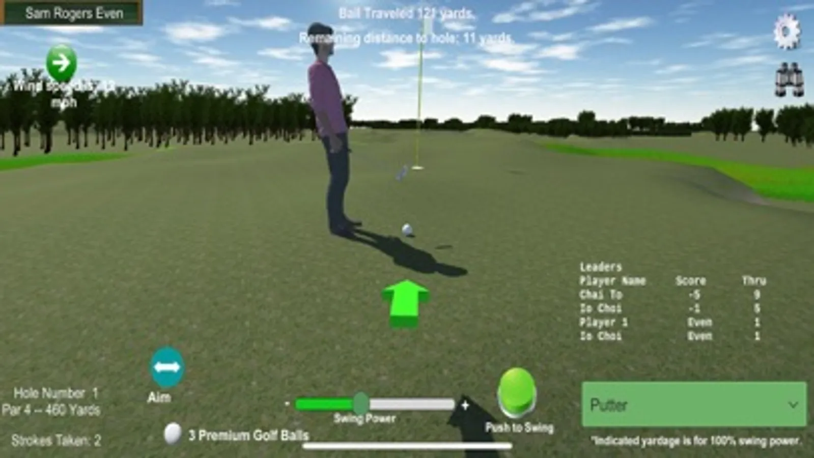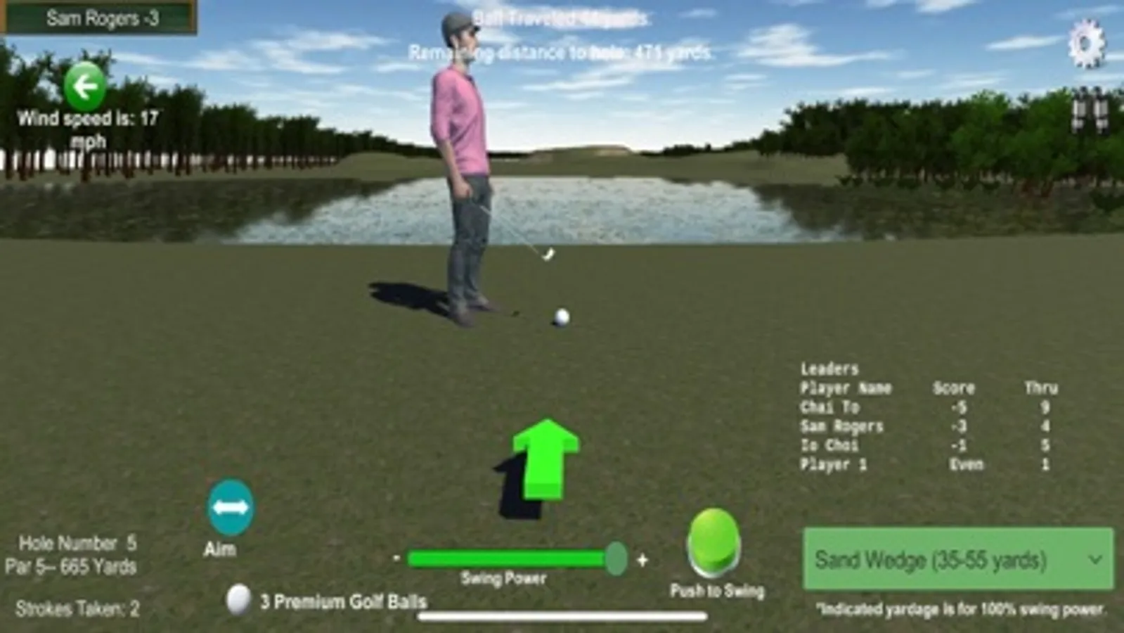 18 hole realistic and challenging golf game, with daily leader-board for all golfers playing worldwide. Full set of golf clubs provided with specialty clubs (Gap Wedge and 60 degree Wedge available). Tournament length golf course. Avoid the sand, trees, rough and water hazards for a good score. Play the 18 hole Hampton's East golf course (Par 72). Capitalize with some good scores on the front nine and prepare for a much more difficult back nine. Random wind that blows through the golf course will create challenging conditions at times. Enhanced golf balls available.