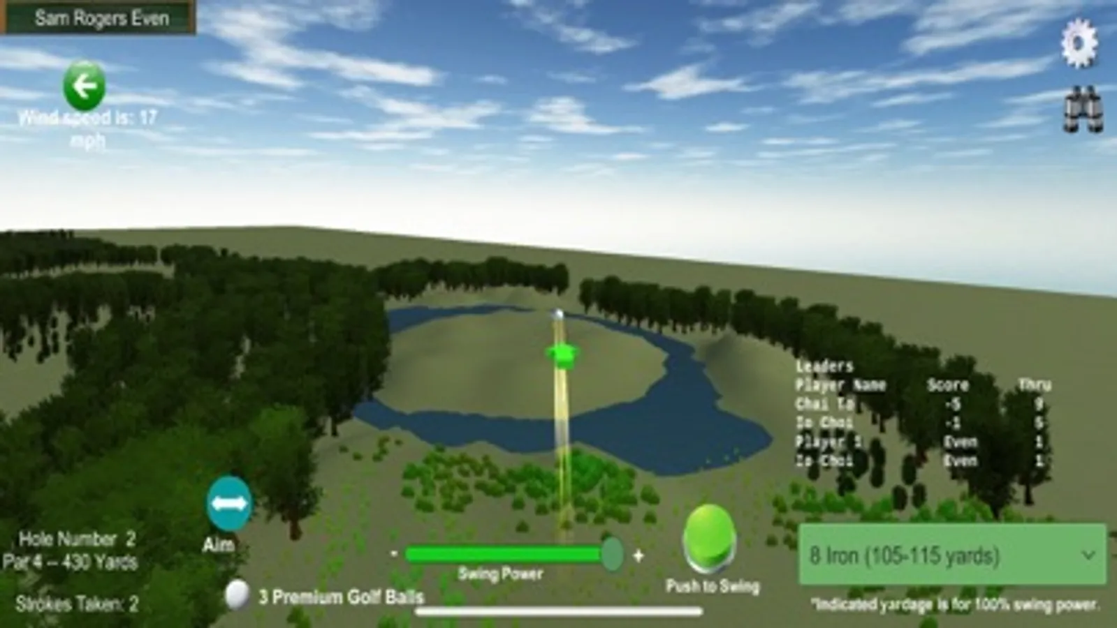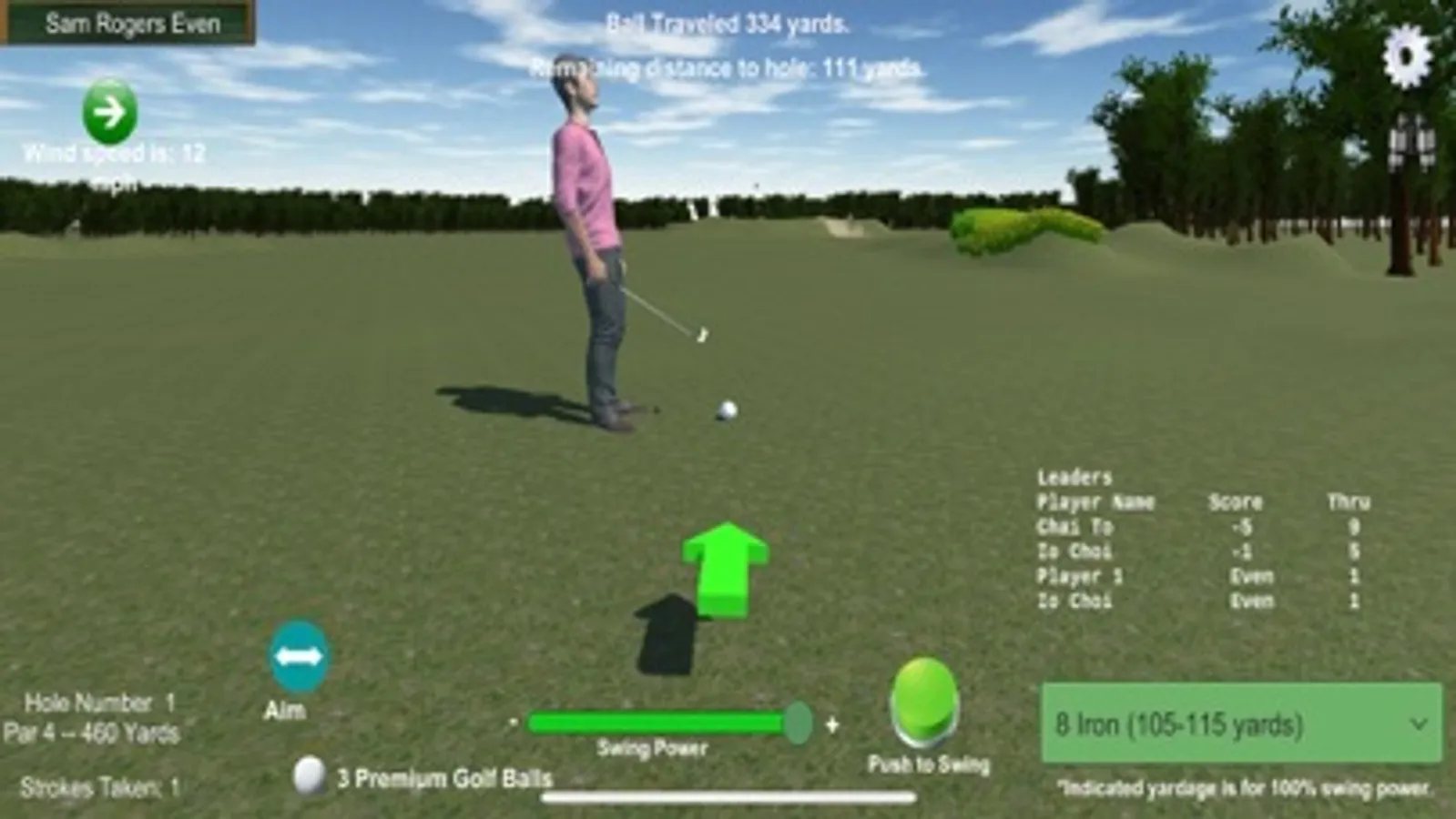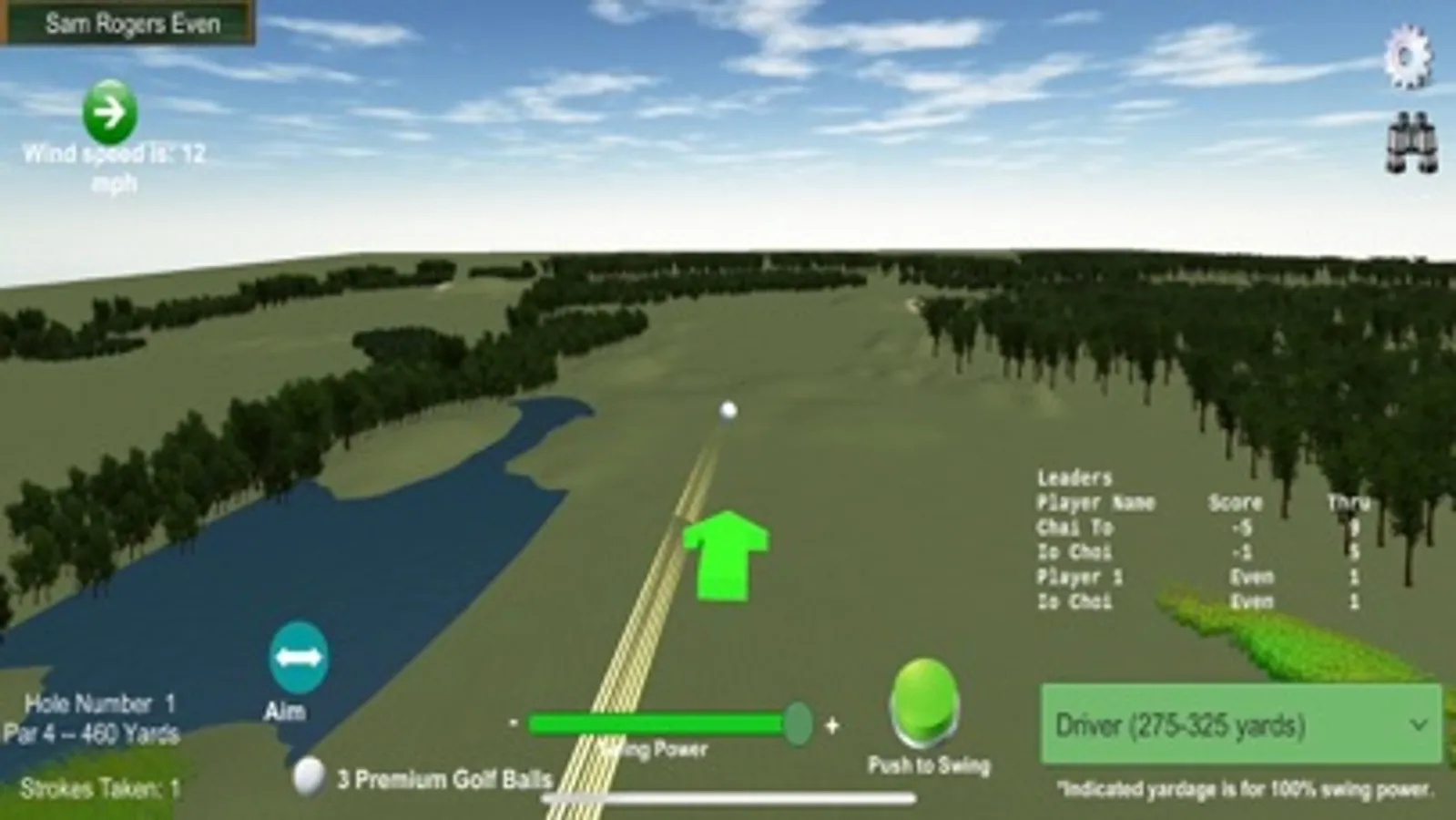 18 hole realistic and challenging golf game, with daily leader-board for all golfers playing worldwide. Full set of golf clubs provided with specialty clubs (Gap Wedge and 60 degree Wedge available). Tournament length golf course. Avoid the sand, trees, rough and water hazards for a good score. Play the 18 hole Hampton's East golf course (Par 72). Capitalize with some good scores on the front nine and prepare for a much more difficult back nine. Random wind that blows through the golf course will create challenging conditions at times. Enhanced golf balls available.