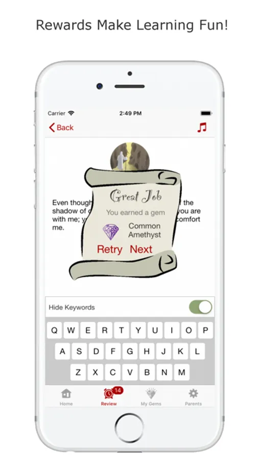 Your kids will earn priceless gems as a reward for typing their verses.