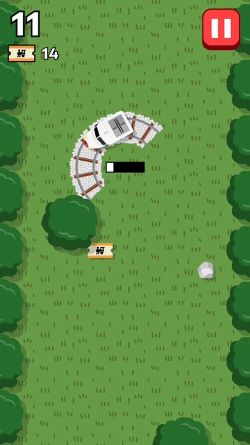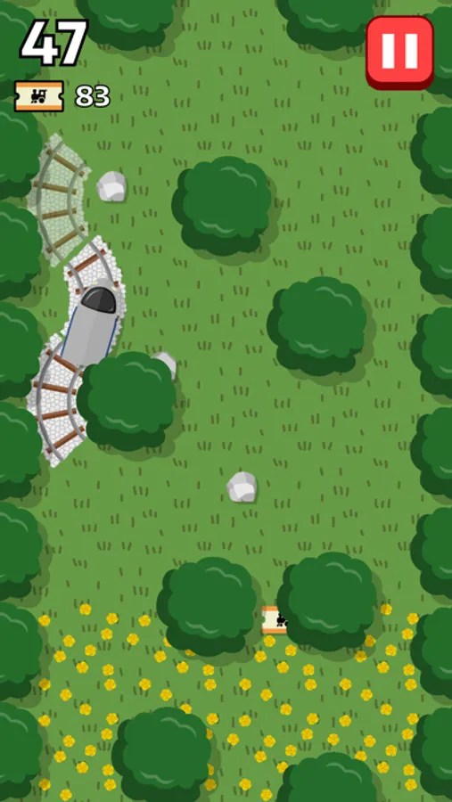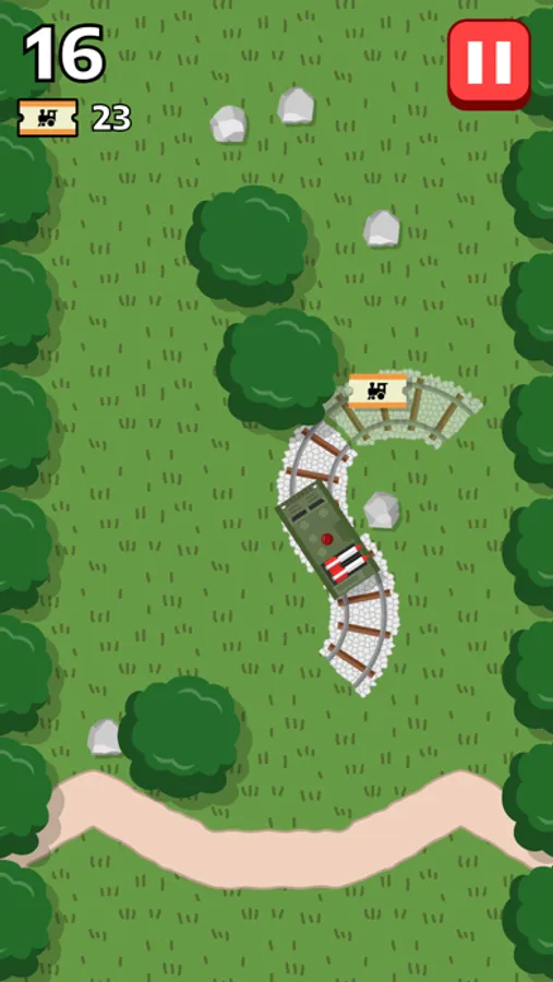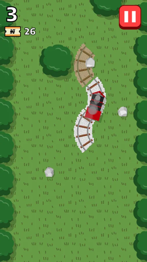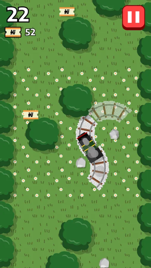 On only two pairs of curved rails, guide a train as far as you can by placing the track behind in front of the other! Quickly, swipe to choose the track direction and tap to place, or the train will run off-rail. Also avoid leading the train into rocks and trees.