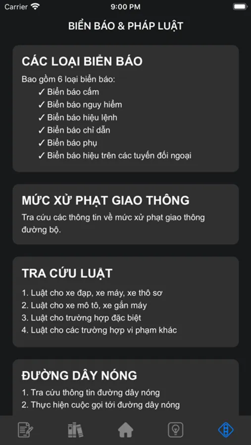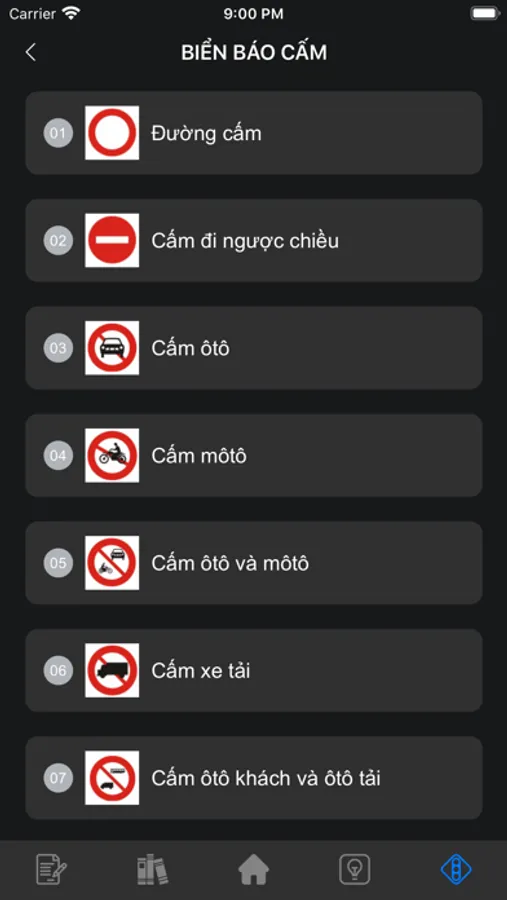 - Học các loại biển báo như biển báo cấm, biển báo nguy hiểm, biển báo hiệu lệnh, biển báo chỉ dẫn, biển báo phụ và nhiều loại biển báo khác