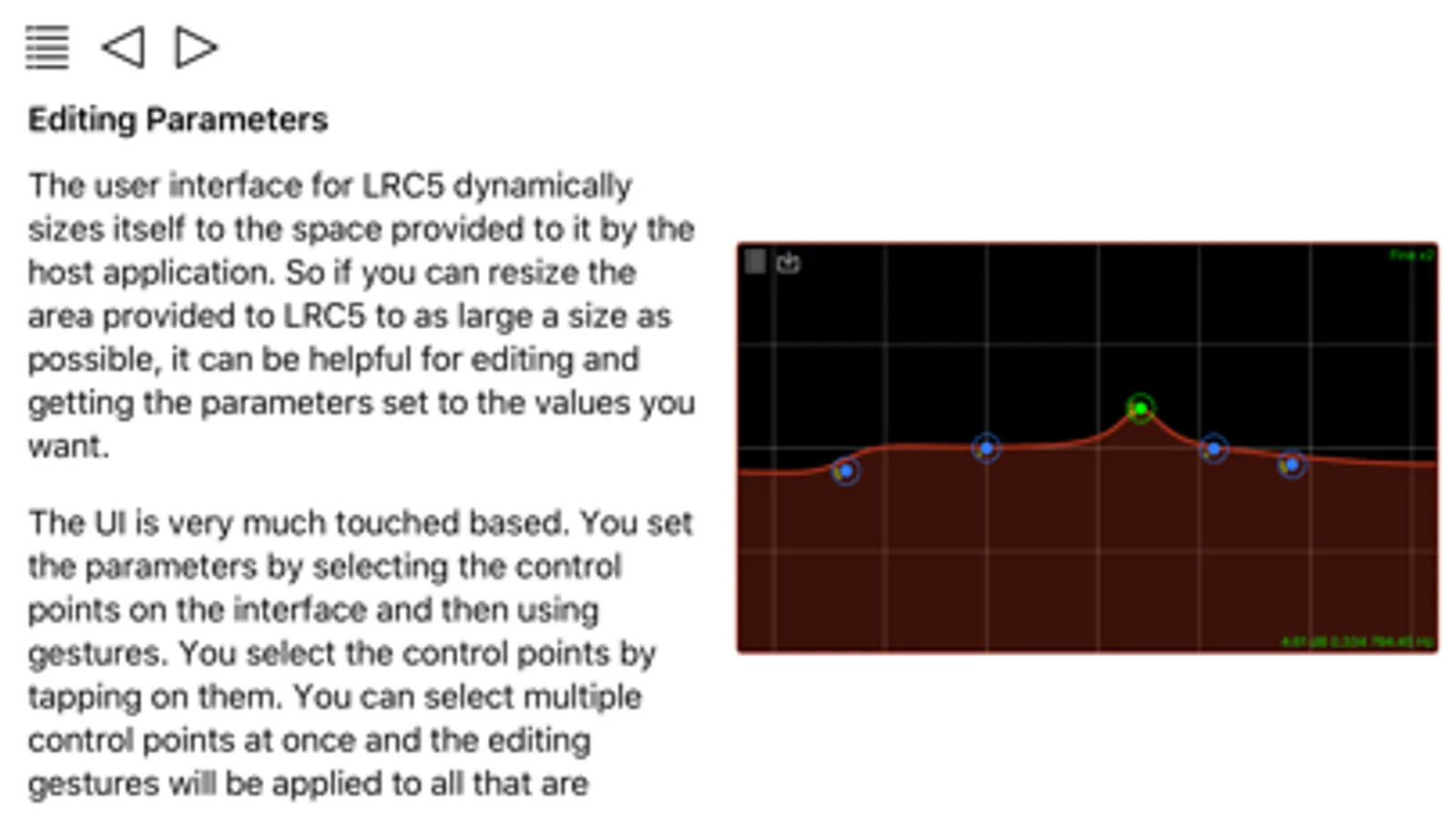 Editing of the control parameters is a bit different than is typical for an EQ. The intention is for it to be comfortable to use on a touch based interface. Please refer to the documentation in this App to learn how to control LRC5.