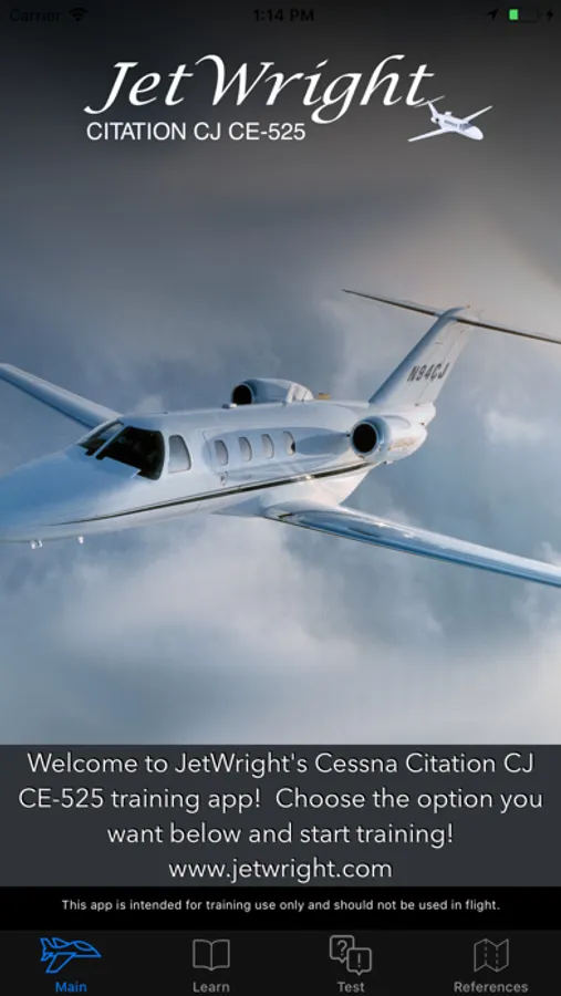 JetWright LLC's Citation CJ CE-525 app contains flash cards, quizzes, training manuals, course syllabus, systems diagrams and references for the Citation CJ CE-525. It is designed to help pilots prepare for their type ratings and annual recurrent checkrides.
