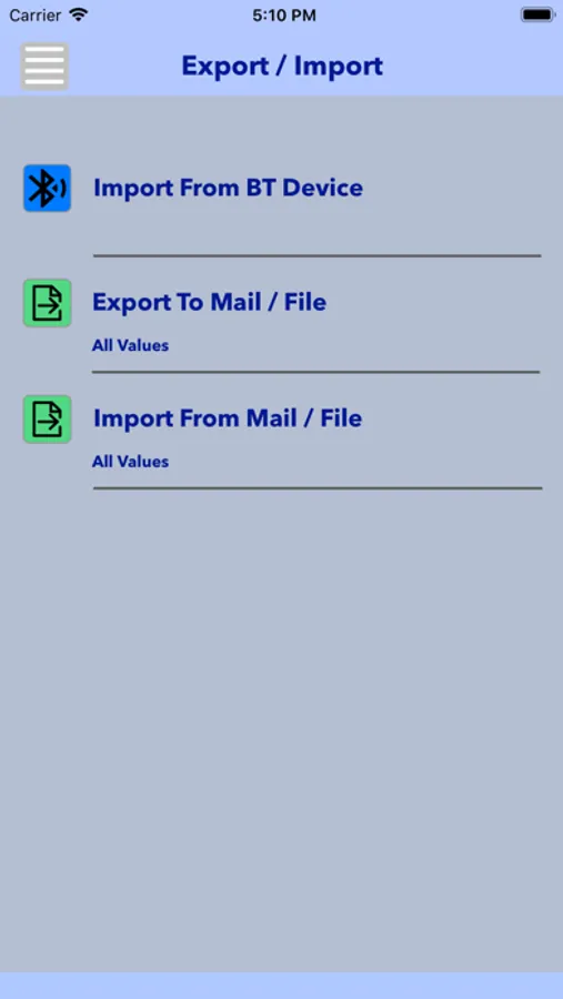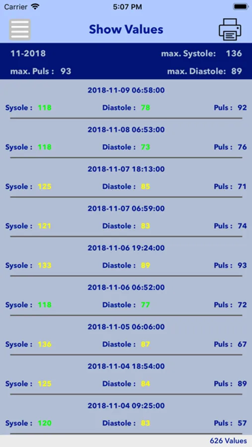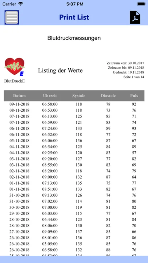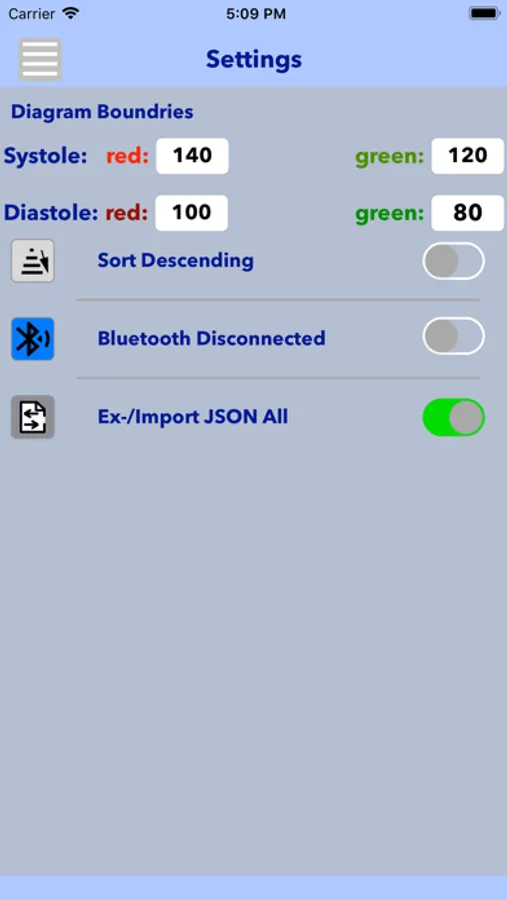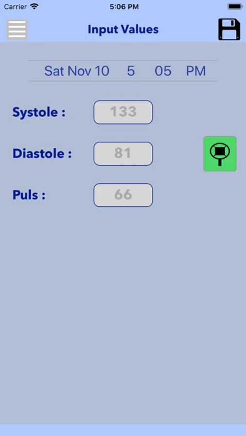 The App gives you the possibility to put in your blood pressure data (Systole, Diastole, Puls and Date/Time). The judgement is possible with fixed or self defined time frames. Also the transfer of your data to a JSON file and mailing it is possible.