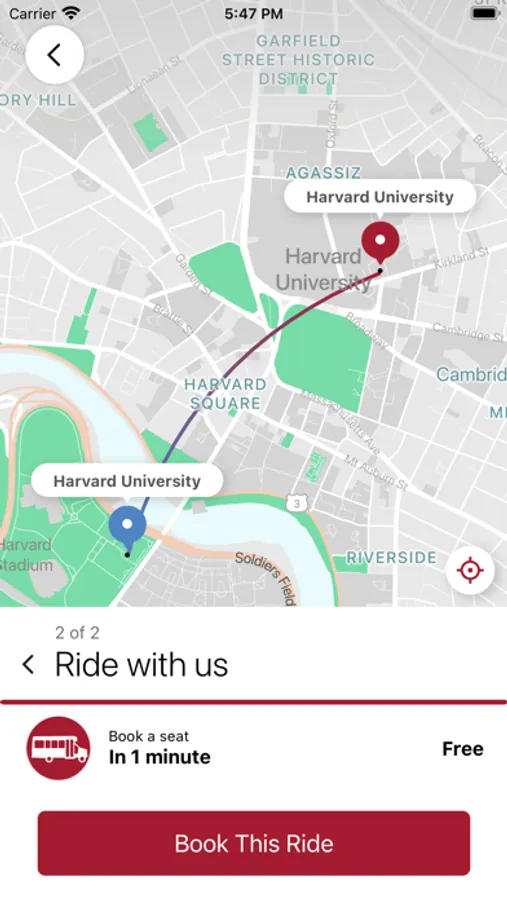 The Harvard Evening Van app enables Harvard students, faculty, and administrators to book on-demand shuttle rides during the Evening Van service hours.