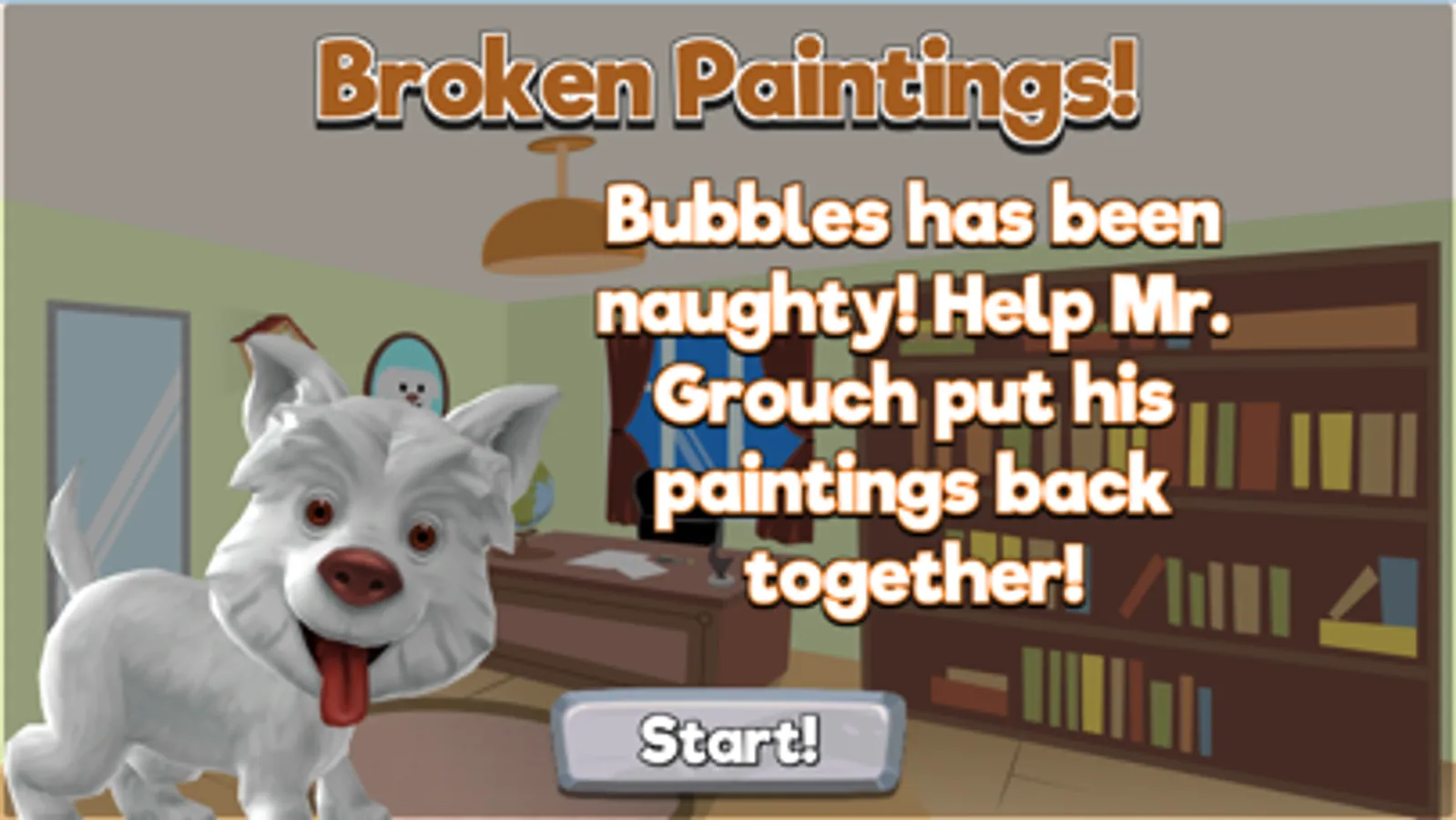 Broken Paintings Game - Bubbles, Mr. Grouch’s dog, has been mischievous again and has broken several of Mr. Grouch’s paintings. How naughty! Help Mr. Grouch re-assemble each painting in this ‘sliding block’-style puzzle game.