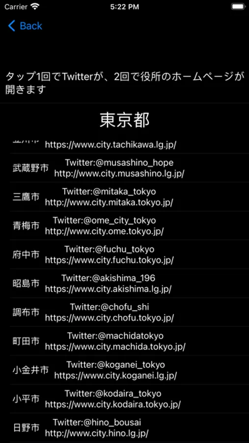 各地域の自治体の災害や防災情報をツイートする公式と思われるアカウントの一覧です。長押しで自治体の最近10件のツイートを見れる様になりました。1回のタップでこのアプリから直接アカウントをブラウザで開くことが可能です。