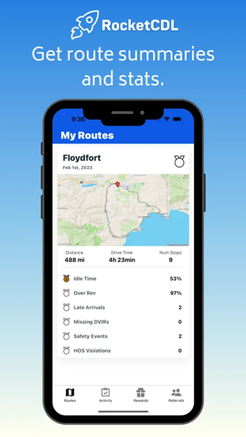 View your driving stats, route summaries, and earn points for hitting driving performance goals.