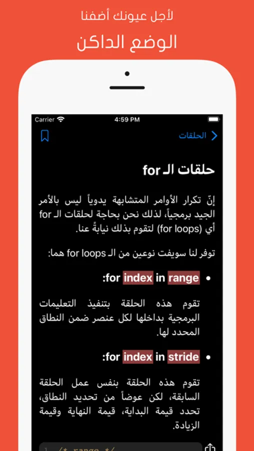 تم صنع هذا التطبيق خصّيصاً للمواطن العربي، وقد تم شرح الدروس فيه بعناية بالغة وبأسلوب مبسّط وأنيق، والهدف هو الوصول لكل شخص يحب البرمجة، أكان لديه خبرة سابقة في هذا المجال أم لا!