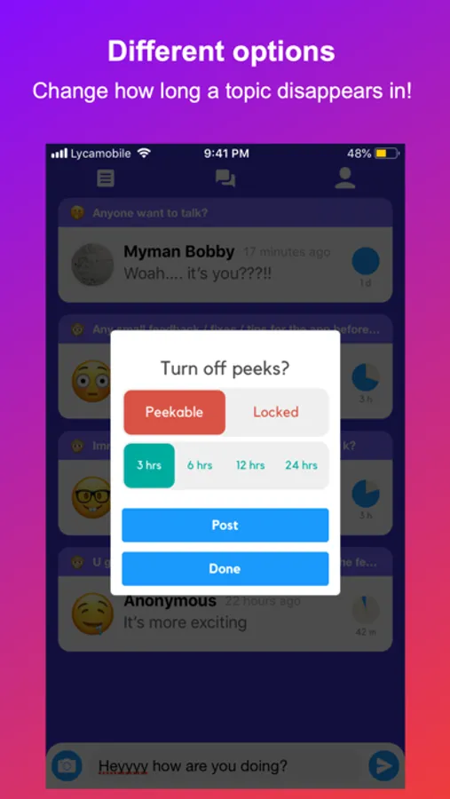 In this social networking app, users can post anonymous topics, share photos, and start conversations with friends. Includes options to set topic durations, disable peeks, and view nearby topics.