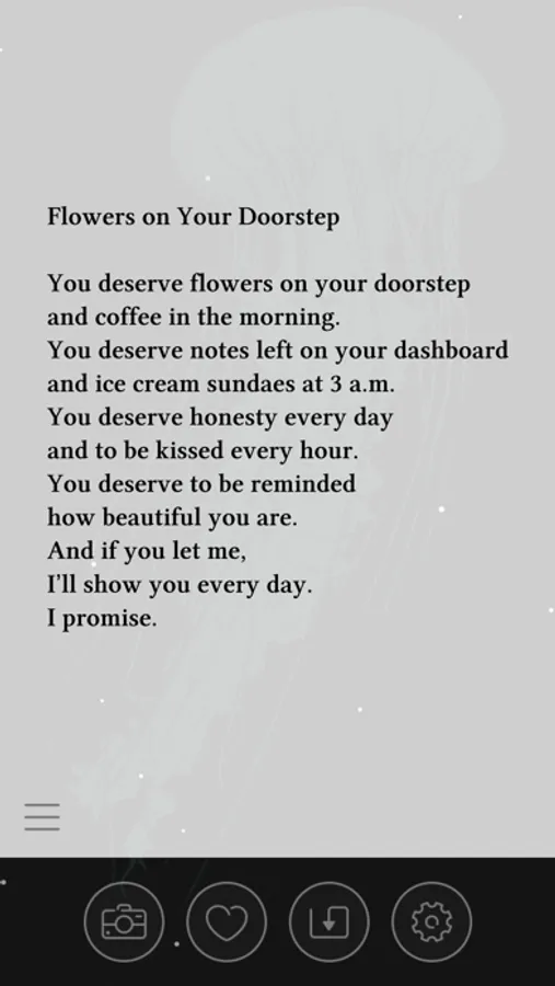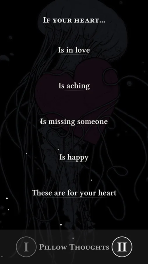 Pillow Thoughts is a best selling poetry collection by Courtney Peppernell. Now you can take Pillow Thoughts with you everywhere you want to go, this app contains sections from both Pillow Thoughts and Pillow Thoughts II, and will be updated with new content as its released. You'll receive a poem sent straight to your phone every day. The app can be used anytime you need it and you can have the words with you, wherever you are.