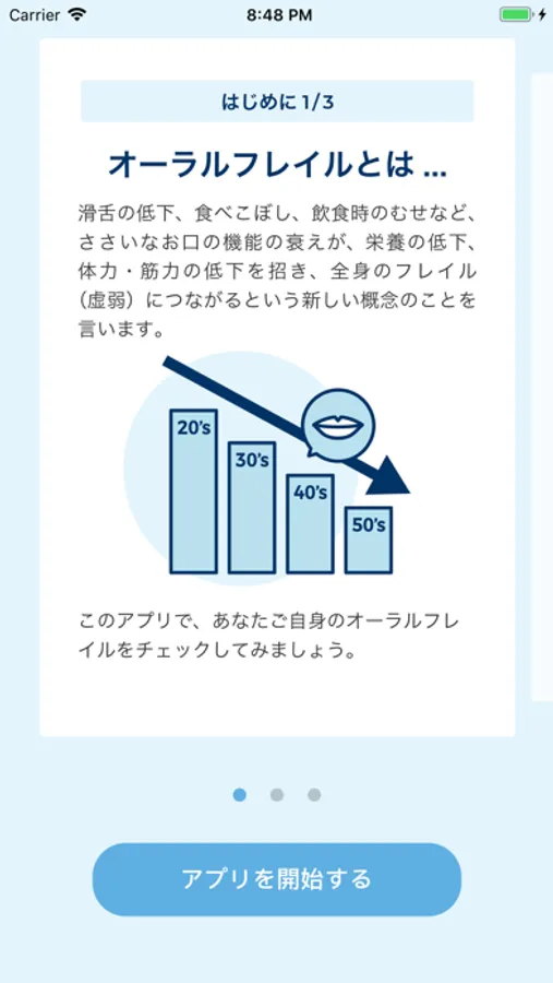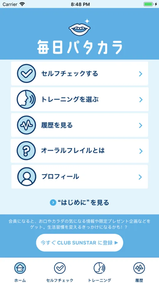 サンスターでは、このオーラルフレイルの抑止に役立つと言われているパタカラ体操に着目し、この体操を活用したセルフチェックとトレーニングを収録したアプリを開発しました。
