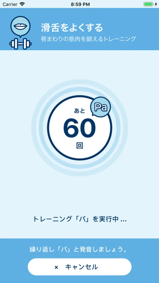 パ、タ、カ、それぞれの連続した発声を毎日行うことで、お口の状況を改善するトレーニングです。実行した記録が残りますので、ぜひ毎日やってみてください。