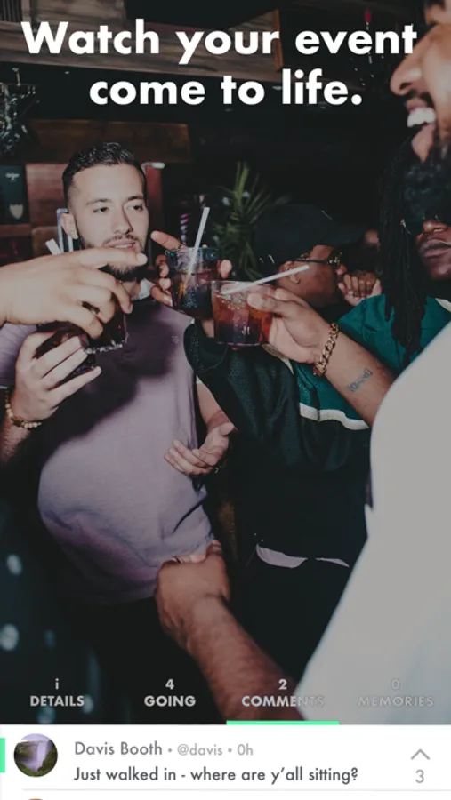 With our simple, event-based invitation model, you can save everyone forty messages of group chat ping pong about what’s happening and who’s going. Instead, toss your friends an invite to an event on PlusOne. Watch your event come to life as your friends join, then figure out the details in the comments. Who, what, when, where, done.
