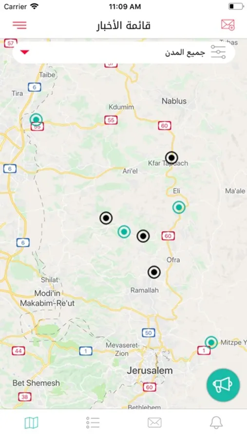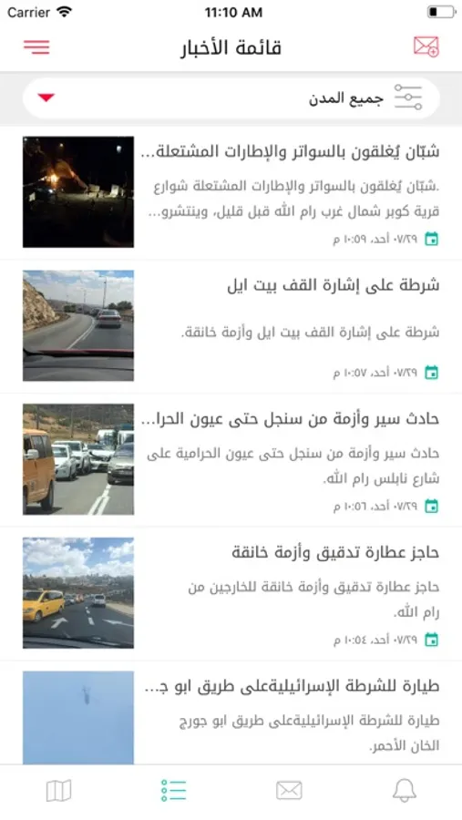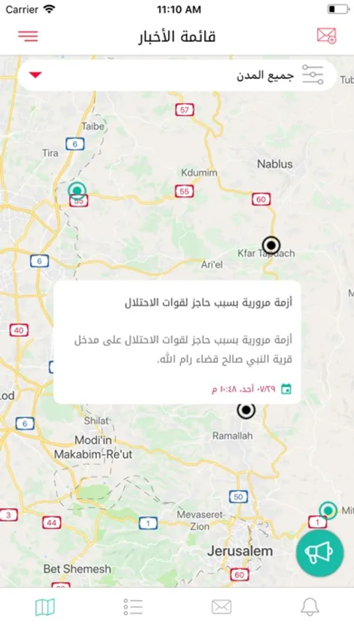 ·عرض اخبار وتحديثات الحواجز من خلال قائمة أو عرض على الخريطة