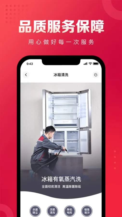 1、家电清洗:提供全品类家电清洗服务,不限品牌、价格透明、在线预约,覆盖全国2640个区县