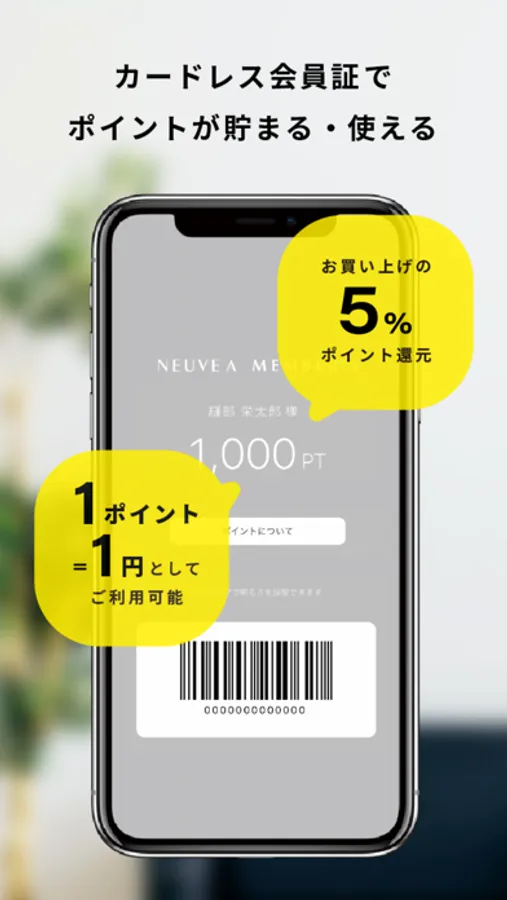 「ヌーヴ・エイ」の全ショップ・オンラインストア共通でポイントが貯まる会員証アプリです。